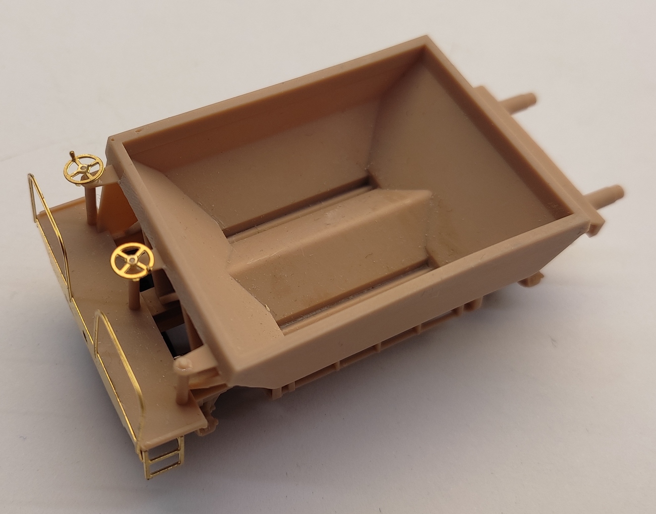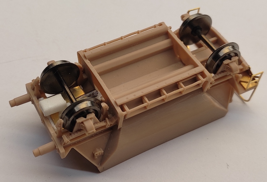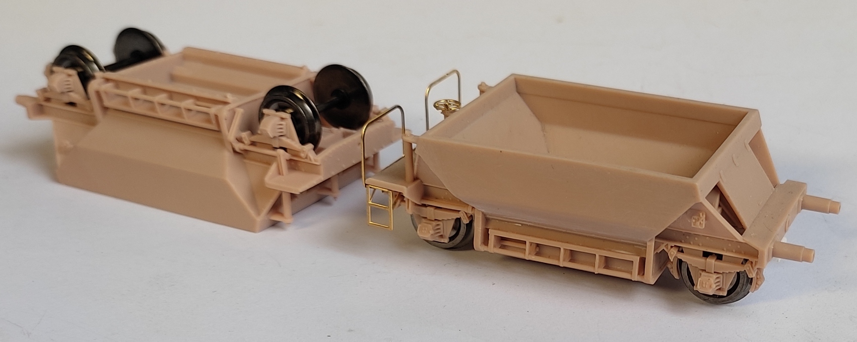 De bouwset bestaat uit twee kunststof wagenbakken met vaste kunststof buffers, messing details zoals de bordessen, losschuiven, hekwerken en handwielen. Ze zijn voorzien van NEM kortkoppeling, wielen en opschriften.