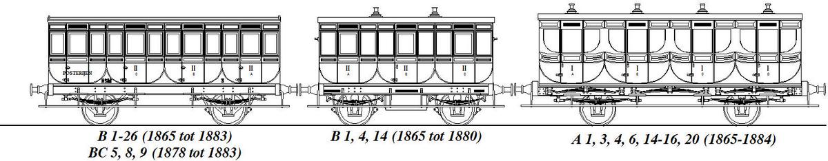 De breedspoor rijtuigen B 1-18 met 3 coupés waren in 1866 op B 1, 4, 14 na